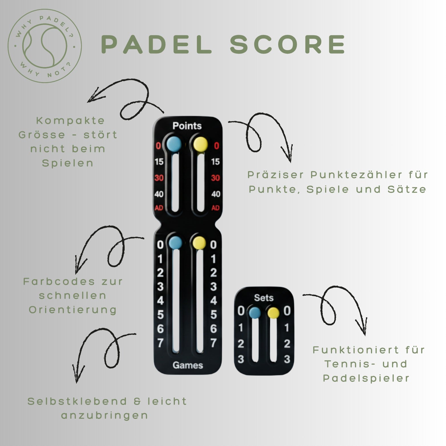 Ja. Der Score Counter ist universell kompatibel und kann auf nahezu jedem Padel- oder Tennisschläger befestigt werden. Die selbstklebende Fixierung sorgt für sicheren Halt ohne den Schläger zu beschädigen.